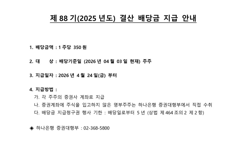 제88기(2025년) 결산 배당금 지급 안내 최고관리자 2026-04-14 최고관리자 0 24 9시간전 2026.04.14 10:36 제88기 배당금 공고.pdf (61.4K) + 2